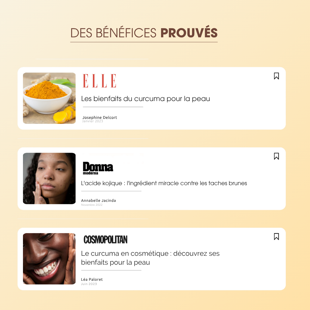 Grâce à l'acide kojique et à la curcumine, il contribue à réduire la production excessive de mélanine.