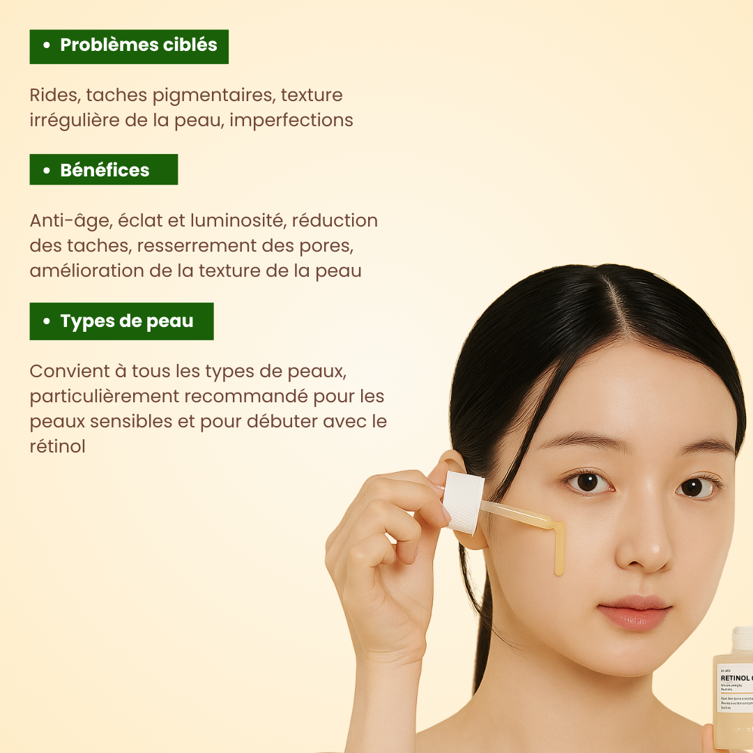 Oui ✅ Cette concentration douce est spécialement formulée pour initier la peau au rétinol sans risque majeur d’irritation. Parfait pour commencer une routine anti-âge ou anti-taches.